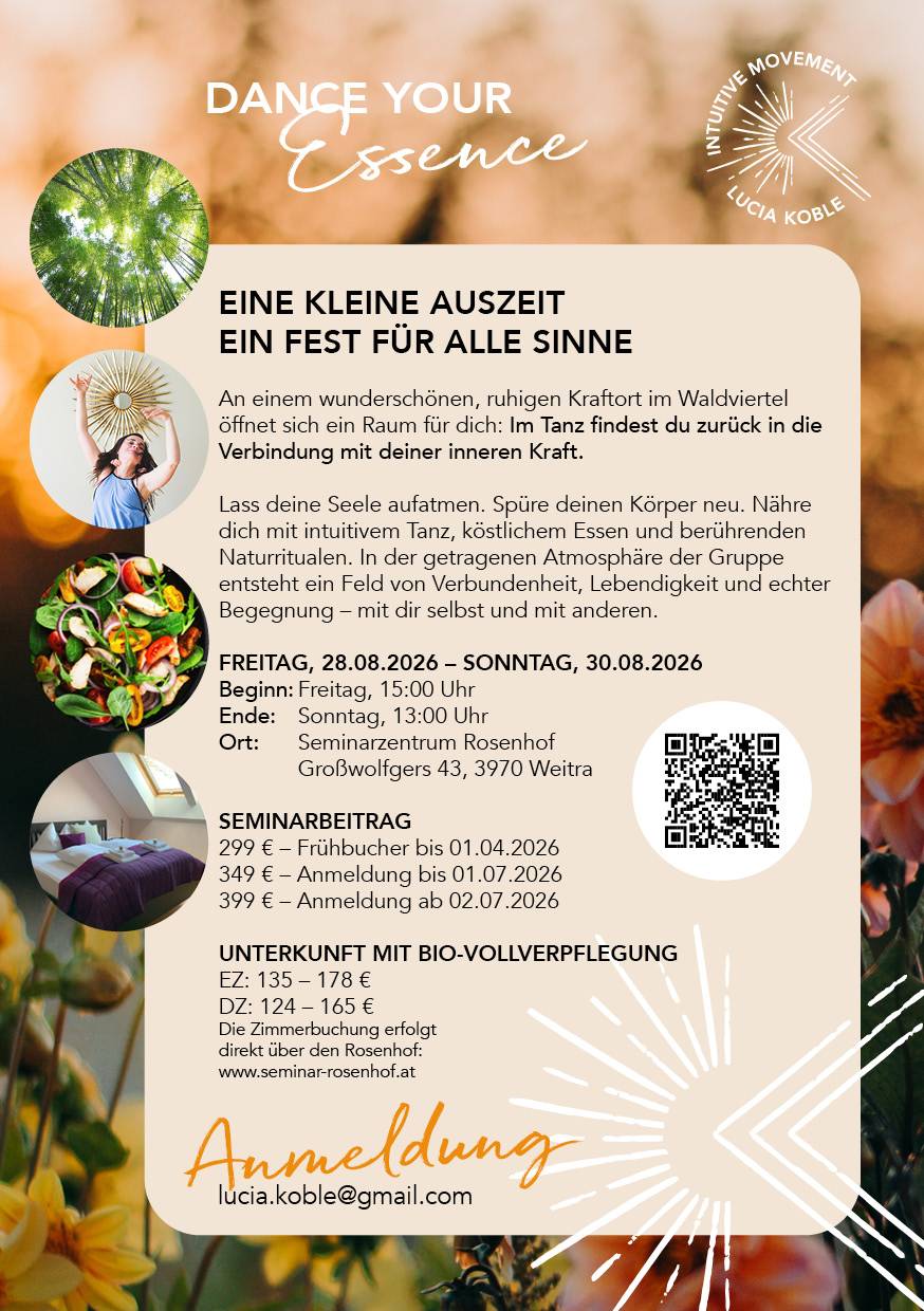 Ich wünsche dir wunderschöne Feiertag, Reader! Frohe Ostern! 🐰🥚🌕✨☀️🌸🌼 Ich freue mich, wenn wir uns am Dienstag, 7.4. (16:30-18h) für Intuitive Movement in der Turnhalle in Stein an der Donau sehen! Du wohnst zu weit weg? Kein Problem! Am Donnerstag, 23.4.26 von 19-20:30h gibt es Intuitive Movement Online! Du kannst dich jetzt schon gerne bei mir anmelden und bekommst dann den Link für Zoom zugeschickt! Reminder: Nur noch 2 Tage gibt es den Spezial Preis für "Dance Your Essence" im August! Ein...